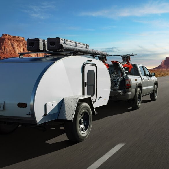 2 Up to 7,150 lbs. maximum towing for 2025 Frontier King Cab® 4x2; 7,000 lbs. for Frontier King Cab® 4x4; 7,070 lbs. for Frontier Crew Cab 4x2; 6,960 lbs. for Frontier Crew Cab 4x4; 6,920 lbs. for Frontier Crew Cab Long Bed 4x2; and 6,760 lbs. for Frontier Crew Cab Long Bed 4x4. Towing capacity varies by configuration. See Nissan Towing Guide and Owner’s Manual for additional information. Cargo and load capacity limited by weight and distribution. Always secure cargo.